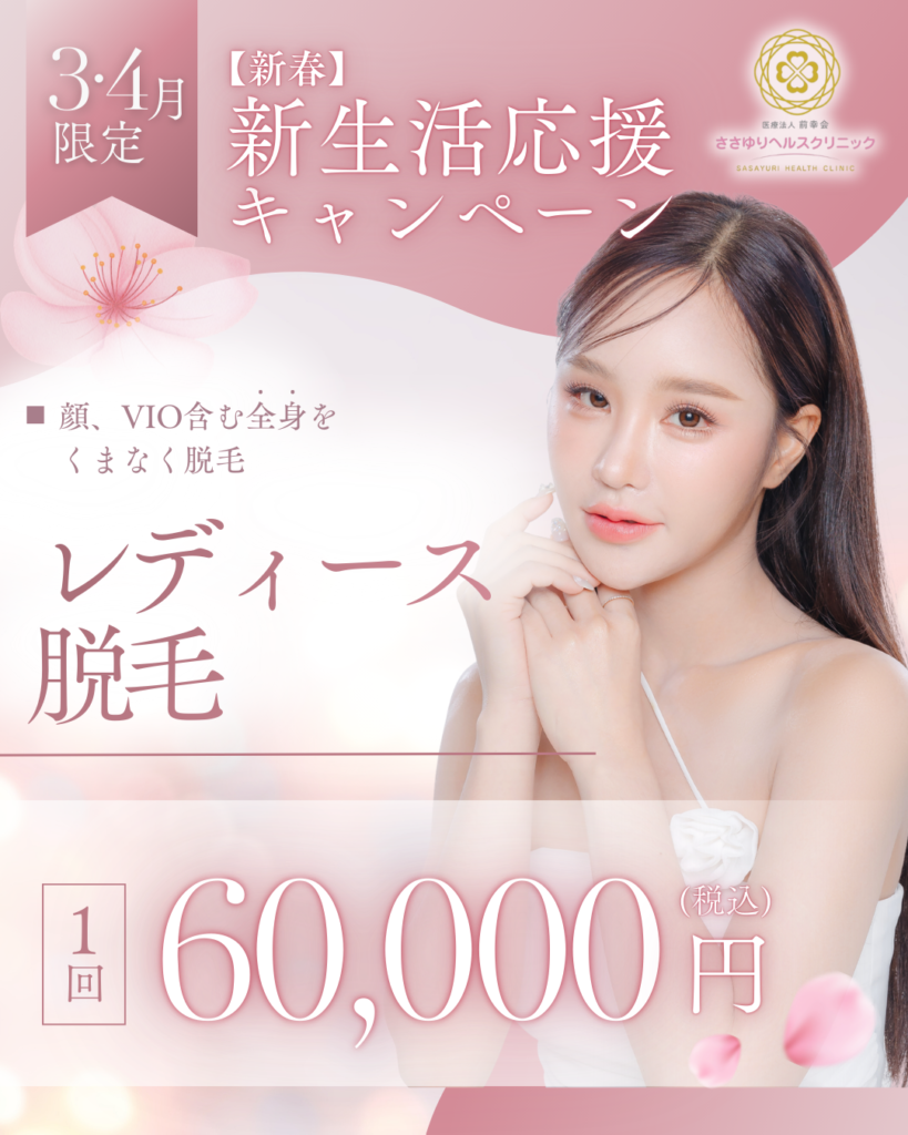 ▶ レディース医療脱毛(顔・VIO含む全身)1回 60,000円(税込)