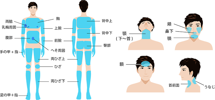 うなじ・額・首前面・手の甲+指・乳輪周囲・へそ周囲・ひざ足の甲+指